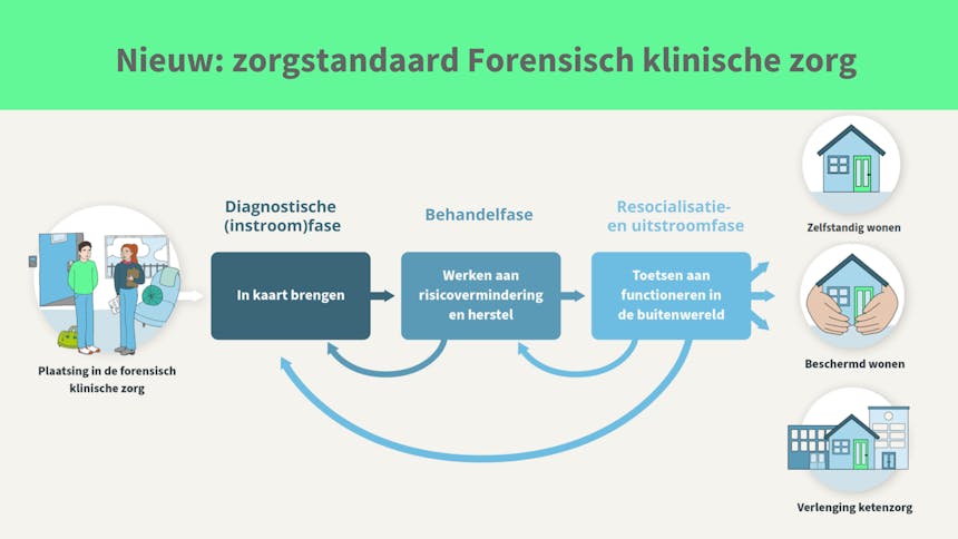 Tijdens een behandeltraject in de forensisch klinische zorg werken professionals uit verschillende disciplines zoals psychologen, psychiaters, vaktherapeuten, verpleegkundig specialisten, sociaal werkers, systeemtherapeuten, sociotherapeuten, groepsleiders, trajectbegeleiders, ervaringsdeskundigen en reclasseringswerkers intensief samen. In de zorgstandaard worden alle fasen van het zorgproces omschreven. Voor elke behandelfase zijn specifieke aandachtspunten met handvatten voor de praktijk beschreven. Ook zijn er hulpmiddelen zoals een samenvatting van de zorgstandaard, werkkaarten en een overzicht met relevante verwijzingen beschikbaar.
