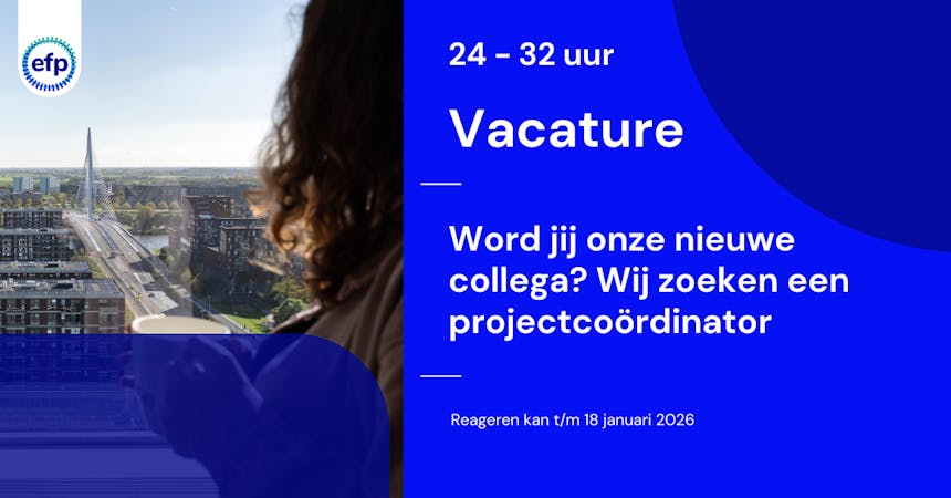 Mail dan uiterlijk 18 januari 2026 je CV en motivatie naar personeelszaken@efp.nl onder vermelding van: sollicitatie projectcoördinator. Reserveer in je agenda alvast tijd op 22 januari voor een eerste gesprek en 28/ 29 januari voor een eventueel tweede gesprek. Uiterlijk 19 januari ontvang je van ons een bericht over het vervolgtraject.